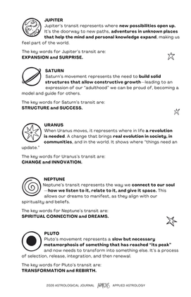 For each planetary transit, you'll find descriptions, reflections and creative prompts that help you:
